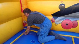 Nicht nur LKW-Planen und Verdecke werden von MAISE fachgerecht repariert. Hier ging einer Hüpfburg die Luft aus. MAISE ist zur Stelle um die Reparatur vorzunehmen.