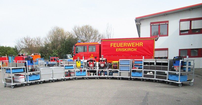Die Feuerwehr Eriskirch am Bodensee erhält 14 individuell nach Kundenwunsch gefertigte Rollcontainer. Sie verfügen jeweils über vier Lenkrollen und eine Totmannbremse. Die Rollcontainer sind robust und für den Einsatz bestens geeignet.